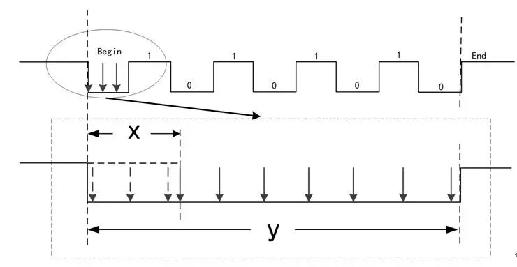 现在我们将这种串口唤醒MCU的原理分析一下。在图 3中,展示了向MCU发送0x55的过程。下降沿开始数据传输,我们把MCU接收到Begin位的过程单独拿出来分析。RXD引脚下降沿唤醒MCU,从执行唤醒操作到MCU执行程序是需要时间的,我们称为唤醒时间x,而串口通信中每一位占用的时间我们称为y,前面说过串口的采样频率是固定的,如果唤醒时间x在MCU的Begin位中占的比例越大,则失真的概率也就越高。