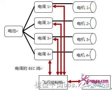 电调有个BEC输出,用于输出5v的电压,给飞行控制板供电,和接收飞行控制板的控制信号;